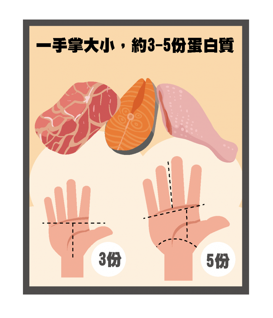 以60公斤的成年人來說,蛋白質一天約需60-70公克,由於身體無法一次保留大量蛋白質,故建議平均分配於三餐,而非集中於一餐。每餐約一個手掌大小的肉類,像魚肉或較少油脂的肉類如雞胸肉,或雞蛋+豆漿/牛奶+半塊豆腐等。